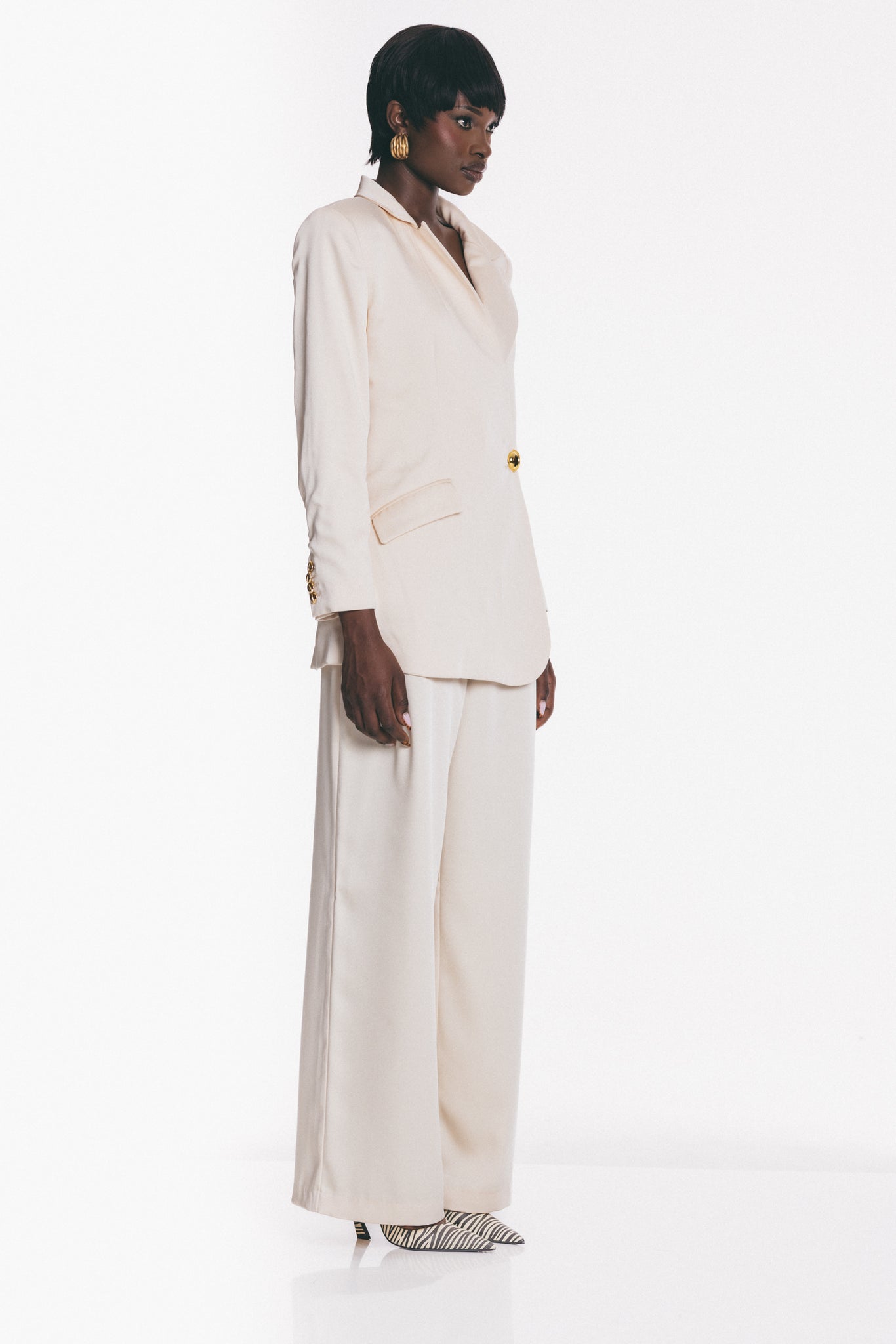 The AISHA set brings the energy. The blazer features strong shoulders, a snatched waist, and bold gold buttons that do all the talking — sharp, structured, and full of attitude. The matching wide-leg pants flow with every step and flatter every shape.