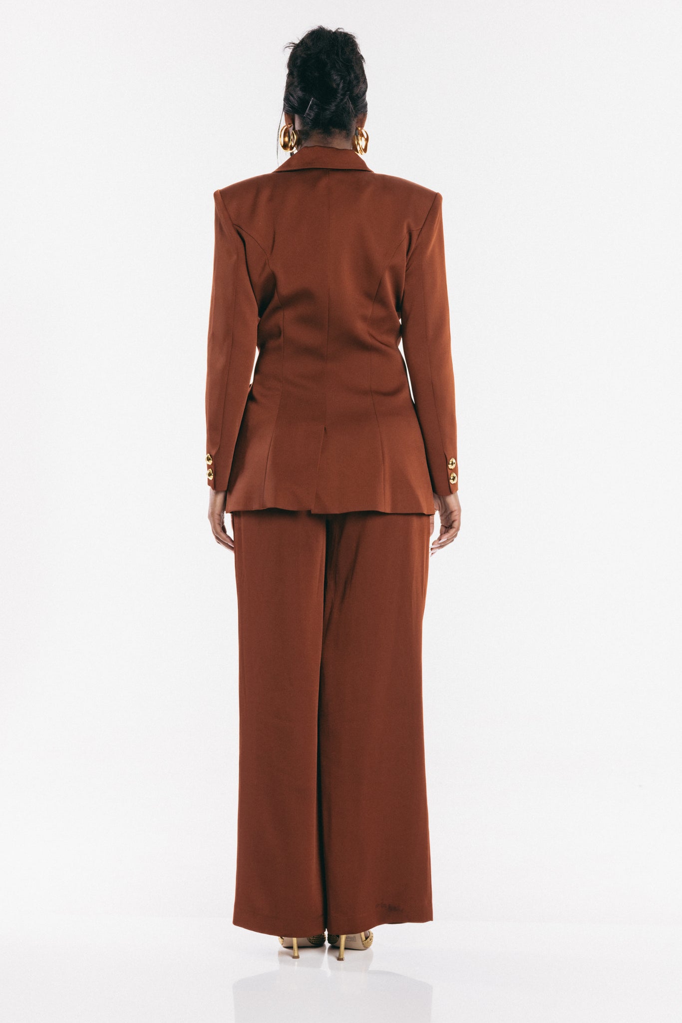 The AISHA set brings the energy. The blazer features strong shoulders, a snatched waist, and bold gold buttons that do all the talking — sharp, structured, and full of attitude. The matching wide-leg pants flow with every step and flatter every shape.