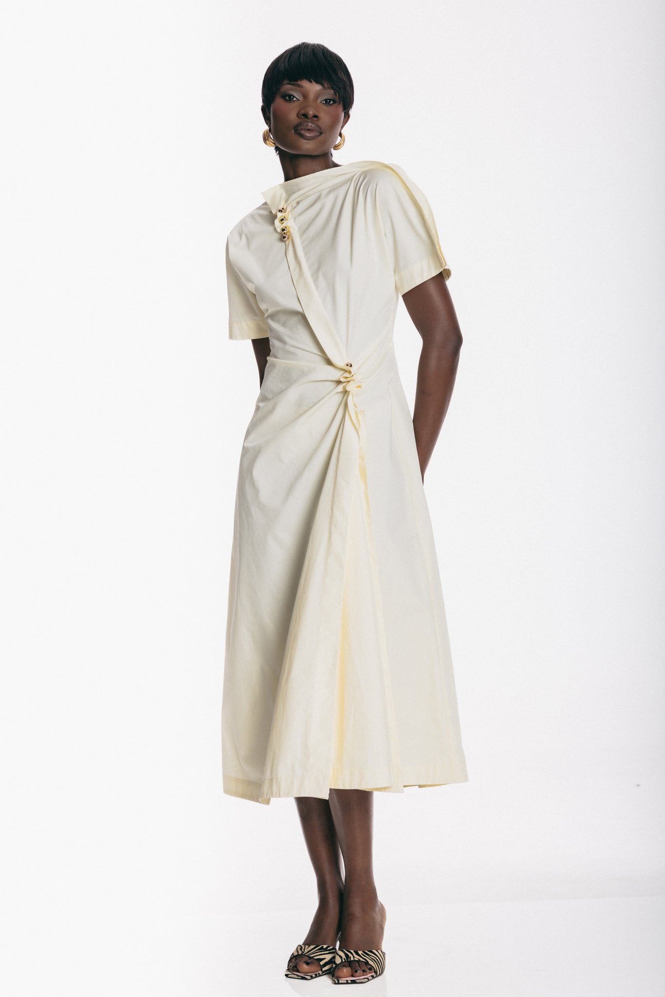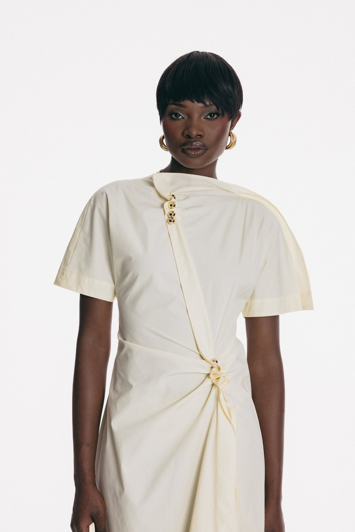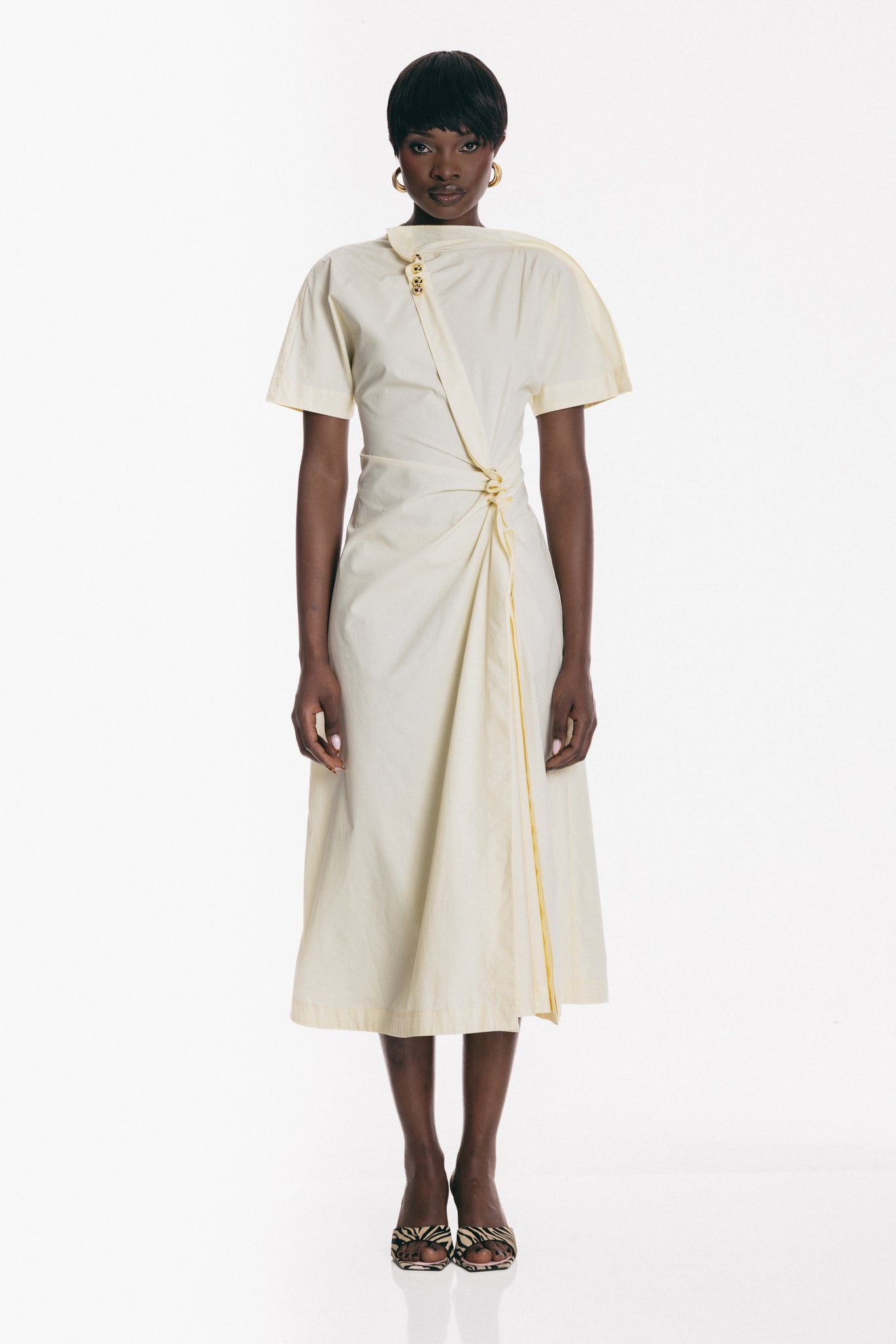 the CECILIA dress is cut from poplin crisp cotton in white and defined by its sculptural draping and gathered knot waist. A high neckline with gold button accents adds polish, while the wrap-style skirt creates a flattering, easy silhouette.